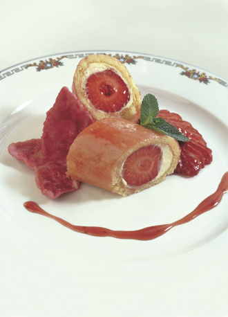 Égouttez le jus dans un chinois étamine. Accompagnez les coeurs de fraisiers de jus de fraise et décorez avec les quartiers de fraise et des pétales de roses cristallisées.