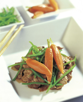 Décrochez les sucs à l'aide d'une cuillère en bois et laissez cuire 6 à 8 minutes. Au moment de servir, chauffez la viande dans la sauce. Mélangez la julienne de pois gourmand avec les carottes.